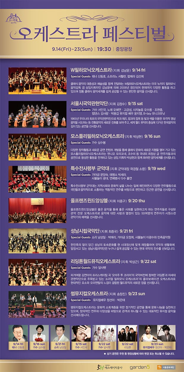 가든파이브 문화숲프로젝트 오케스트라 페시트벌 2012-09-01 by 편리 9월엔 가든파이브에서 오케스트라 공연을 볼 수 있겠구나.. 서인국이랑 달샤벳도 온다는데.. 기대해도 될지 모르겠다.무료로 이런 공연을 볼 수 있다는 것은 어쩌면 정말 행운인지도 모르겠다. 대신 쇼핑 하느라 돈이 많이 나가는 거 빼면뭐 가든파이브.. 일하기에 나쁘지 않은 곳이다. ㅋ 오늘도 공연이 있는데.. 하필 그 시간에 누가 온다니.. 짜증이다.