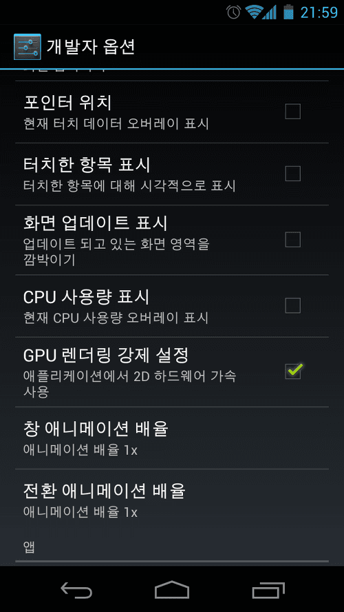 갤럭시 넥서서에 GPU 강제 랜더링 설정했더니