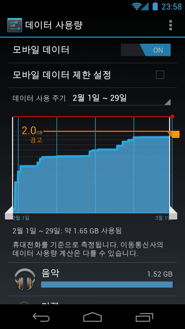 아마도 구글 뮤직을 이용해서 스트리밍으로 음악을 좀 들었는데 그것때문에 생각보다 많은 데이터를 사용했나 보다.