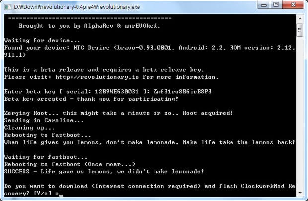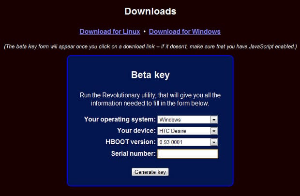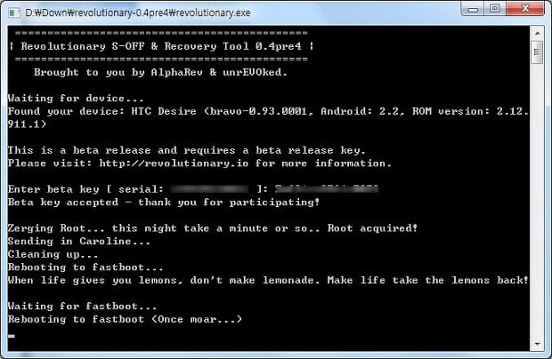 디자이어의 시리얼 번호를 입력하면 키가 생성된다. 이 키값을 따로 보관했다가 S-OFF 과정에서 입력하도록 한다.