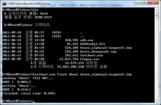 CMD 창에서 fastboot.exr flash hboot HBOOT이미지.img 이런 식으로 입력한다.