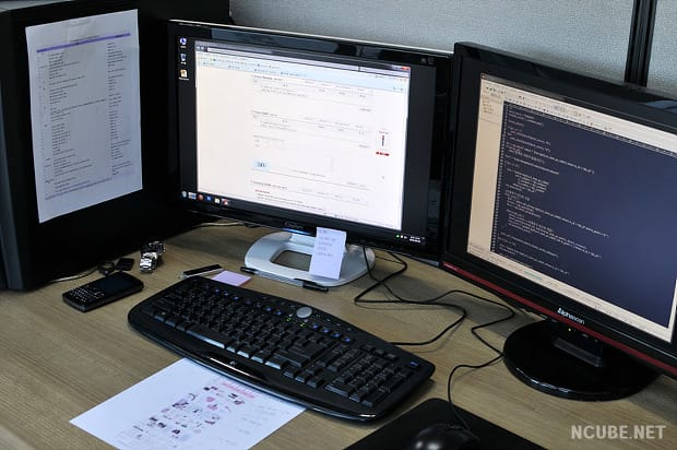 뭐 여전히 모니터는 두 개를 사용하고 있고 모니터 하나는 브라우저, 다른 한쪽에는 에디트플러스가 실행 중이다.