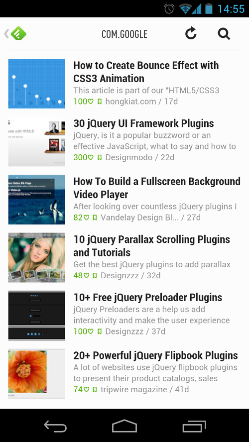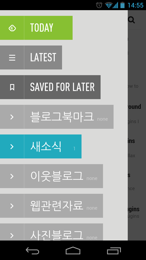 안드로이드 RSS 리더 Feedly 2013-03-18 by 편리 구글 리더 서비스가 종료된다는 소식을 접하고 어떤 걸 사용해야하나 검색을 해보니 Feedly를 많이들 사용하는것 같아 나도 설치를 해봤다. 일단 UI가 정말 마음에 든다. 포스트를 보는 것도 쉽고 무겁지도 않은 듯 하여 만족하면서 사용하고 있다. 설치는 구글 플레이 스토어에서 설치하면 된다. Feedly 바로가기지금까지 느낀 단점이라면 RSS 갱신 주기가 구글 리더 보다는 긴 것 같다는 것이다. 그외에는 특별히 문제점도 없고Feed에만 집중하게 해주는 UI 덕분에 포스트 하나하나를 더 주의깊게 읽게 되는 것 같다.