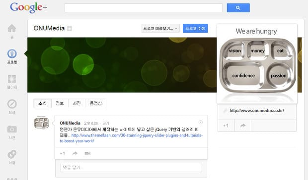 아~ 이젠 구글 플러스 페이지까지 만들고 있다. 이런 건 처음해보는 거라 제대로 한건지도 모르겠고.. 애매하다.