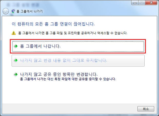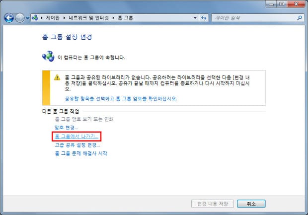 홈 그룹에서 나가기를 클릭합니다.