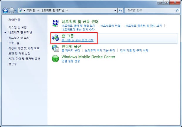 홈 그룹 설정하는 부분이 잇습니다. 홈 그룹 및 공유 옵션 선택을 클릭합니다.
