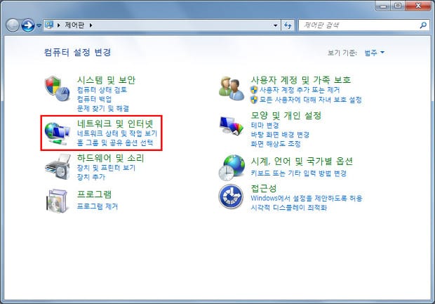 제어판 -> 네트워크 및 인터넷 설정 부분을 클릭합니다.