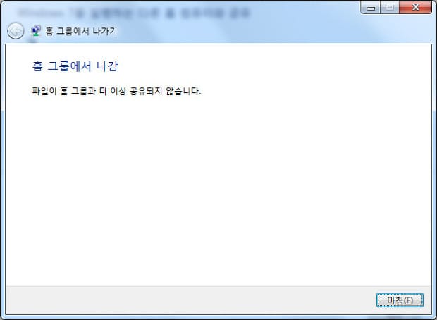 홈 그룹에서 나가기를 완료 했습니다. 이제 홈그룹 관련 서비스를 중지해애 합니다.