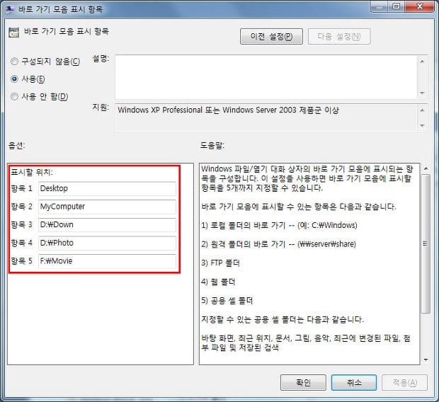 위 이미지처럼 표시할 위치를 설정해주면 됩니다. 예로 Desktop은 바탕화면, MyComputer는 내 컴퓨터입니다.