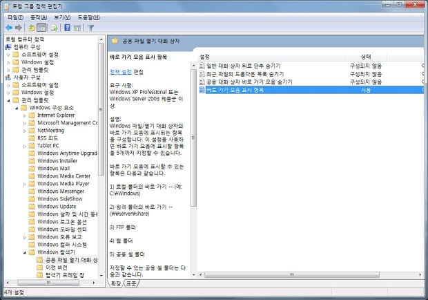 그룹정책편기가 실행되면 사용자 구성 -> 관리 템플릿 -> Windows 구성 요소 -> Windows 탐색기 -> 공용 파일 열기 대화 상자 -> 바로 가기 모음 표시 항목 을 찾습니다. 바로 가기 모음 표시 항목을 더블클릭합니다.