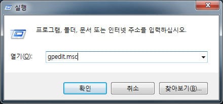 윈도우 실행창에 gpedit.msc를 입력하고 확인을 누릅니다. 그룹정책 편집기를 실행시키기 위함입니다.