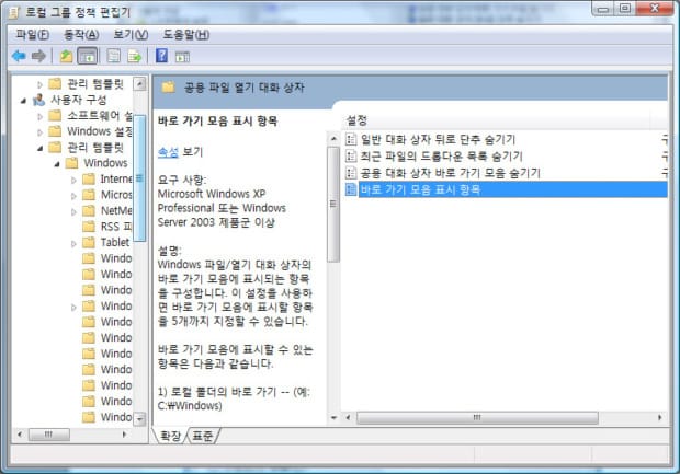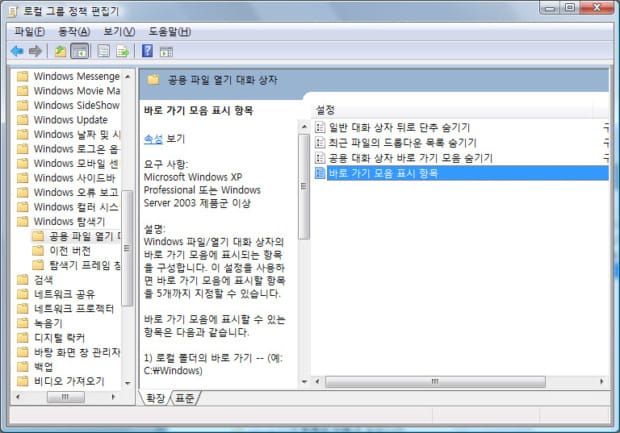 실행 창에 gpedit.msc를 입력해서 로컬 그룹 정책 편집기를 실행합니다. 그런 다음 사용자 구성 -> 관리 템플릿 -> Windows -> Windows 탐색기 -> 공용 파일 열기 대화 상자를 클릭합니다.