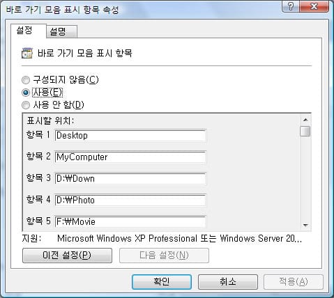 항목은 자신이 좋아하는 것으로 수정하시면 됩니다. 저는 바탕화면, 내컴퓨터, 그외 하드의 폴더가 보입니다.