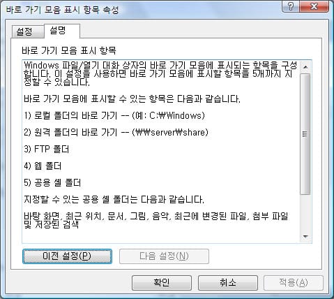 ㅎㅎ 왜인지는 모르겠는데, ‘공용 대화 상자 바로가기 모음 숨기기’ 설정이… ‘사용’으로 되어있더군요.-_-;;; 클릭 한번, 그리고 로그오프 한번도 제대로 설정했습니다. 비스타 쓴지 몇달됐는데… 속이 다 시원해지는군염.-_-v