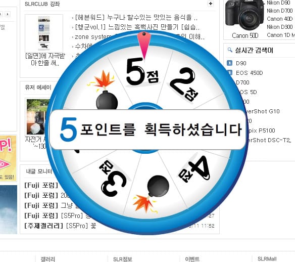 SLRCLUB 뺑뺑이에서 오랜만에 아마 두번째인 것 같은데.. 최고 점수인 5점을 획득했다. 다른 분들에겐 크게 관련이 없는 5점이긴 하지만.. 왠지 주말아침인데 기분이 좋다. 잠도 평소보다 잘 잔 것 같아서 기분이 좋고.. 오늘은 또 사진을 찍으러 가기로 해서 약간 마음이 들떠 있는데.. 5점까지 얻게 되다니.. 왠지 오늘은 좋은 일이 있을 것 같은 느낌이랄까? 소소한 것에 기뻐하고 행복해한다면 언젠가는 분명 좋은 일이 있을 것이라 생각한다. 지금은 조금 힘들지만.. 힘든 일이 있기에 기쁨과 행복을 알 수 있고 그것을 희망하며 하루하루를 살게 되는 것이 아닌가 생각해 본다. ^___^