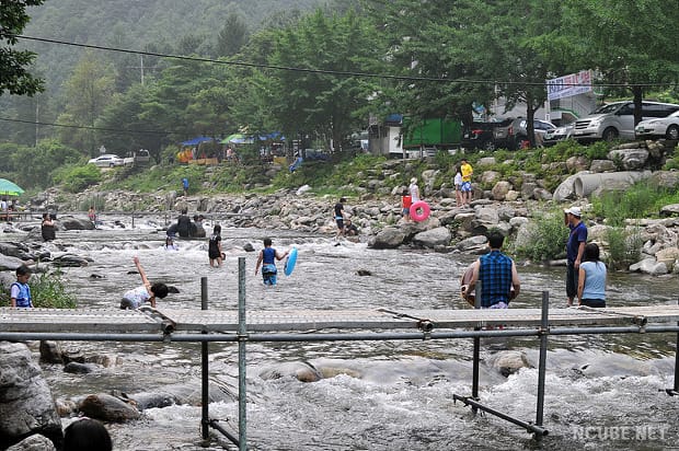1시간 좀 넘게 정신없이 걷다보니 어느 새 수목원을 한바퀴 돌아 다시 입구에 도착해있었다. 이제는 다시 두번째 목적지인 용추계곡을 향해서 출발을 해야만 했다. 배가 너무 고팠기 때문에 무엇보다 빨리 밥을 먹고 싶다는 생각이 너무도 간절했다. 아침도 삼각김밥으로 대충 해결하고 1시간이 넘게 걸었으니 배가 고플만도 했다. 차를 타고 출발했다. 40여분 정도 시간이 걸려서 용추가 계곡에 도착했다. 예약해둔 방갈로에 서둘로 짐을 옮기고 숯불을 피워 삼겹살과 목살, 새우 등등을 굽기 시작했다. 제일 어른 두분이서 맛잇게 고기를 구워주셨다. 덕분에 고기가 더 맛있었다는..