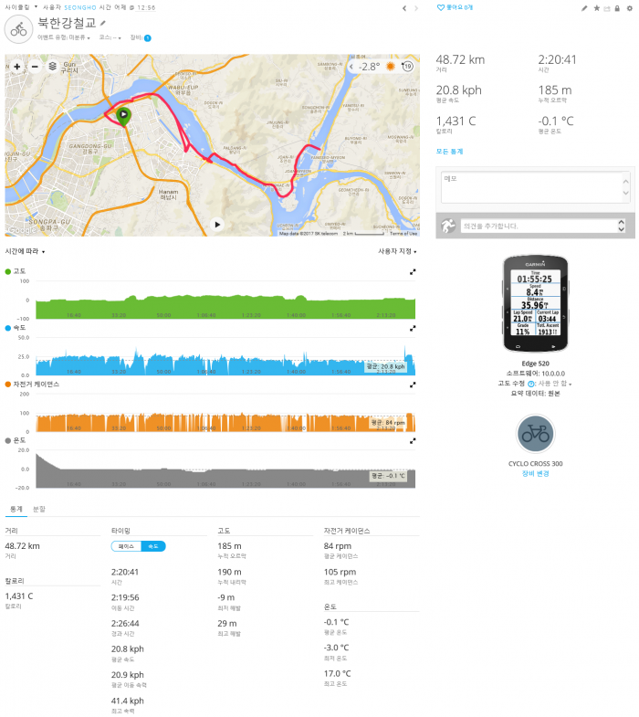 평소보다 시간이 오래 걸렸다. 추운 날씨에 엄청난 역풍에 도무지 앞으로 나아갈 수가 없었다. 북한강철교에서 집으로 돌아올 때 말이다. 그렇다고 해서 딱히 다른 방법이 있는 것도 아니고 그냥 꾸역꾸역 페달을 밟으면서 조금씩 나아가는 것 밖에는.. 집에 도착하면 왠지 몸살이 날 것만 같은 느낌이었지만.. 그래도 다행히 따끈한 물로 샤워를 하고 푹 쉬었더니 몸살이 나지는 않았다. 방한 의류가 아니었으면 큰 일날 뻔 했다. 토요일도 자전거를 타고 싶었지만 몸 상태가 좋지 않아서 집에서 쉬기로 했다. 그리고 일요일 다시 자전거를 탈 생각이었다.