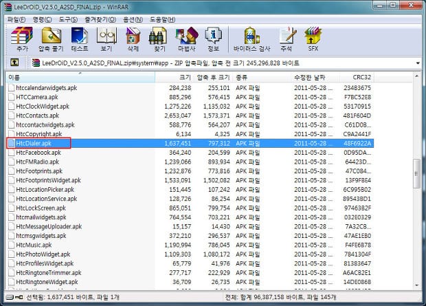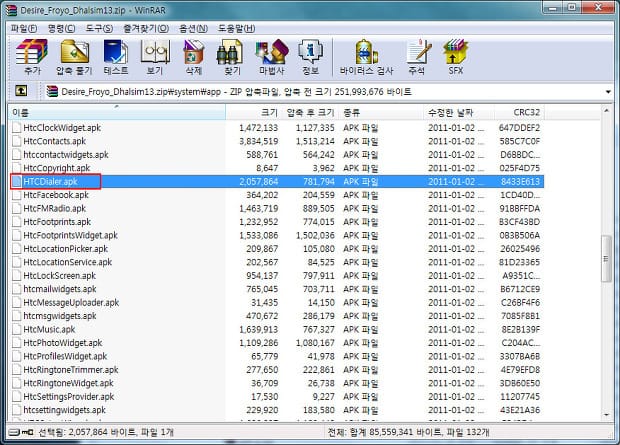 다음으로는 달심고수님 구센스 13버전 롬에서 systemapp 안의 HtcDialer.apk 파일을 추출한다.