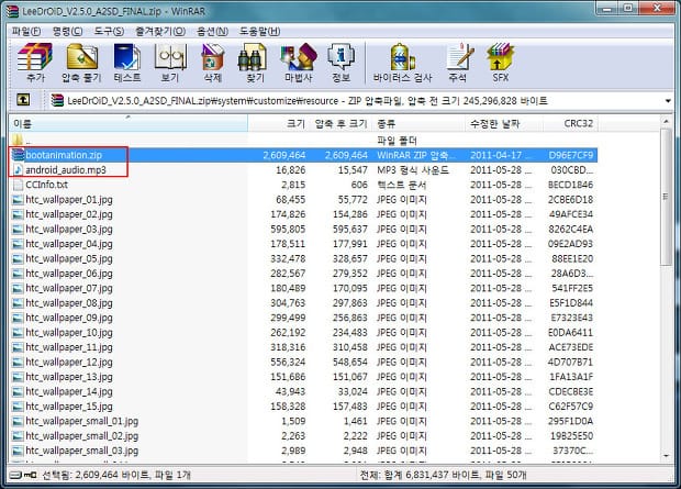 그리고 한가지 더 부팅 애니메이션을 변경하려면 아래처럼 systemcustomizeresource 안의 bootanimation.zip 파일을 변경해주면 된다. 또 LeeDrOiD롬 특유읠 부팅시 사운드는 android_audio.mp3 파일을 변경해주면 된다. 이 파일을 삭제하면 부팅시 사운드가 나오지 않게 된다. 삭제해도 부팅에 문제는 없다.