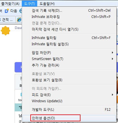 이것을 없애는 방법은 우선 인터넷 익스플로러에서 메뉴 부분의 도구 -> 인터넷옵션을 클릭한다.