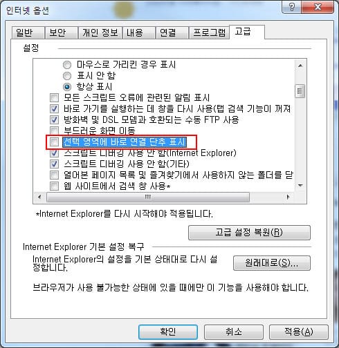 고급 탭으로 이동하여 아래처럼 선택 영역에 바로 연결 단추 표시 부분의 체크표시를 지워주면 된다.