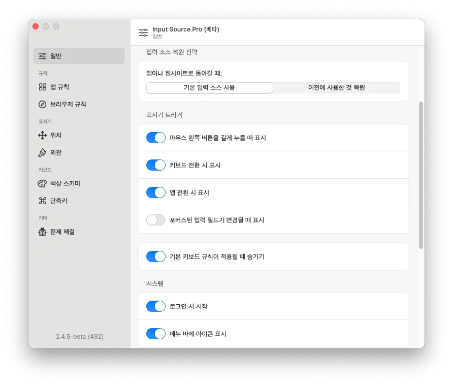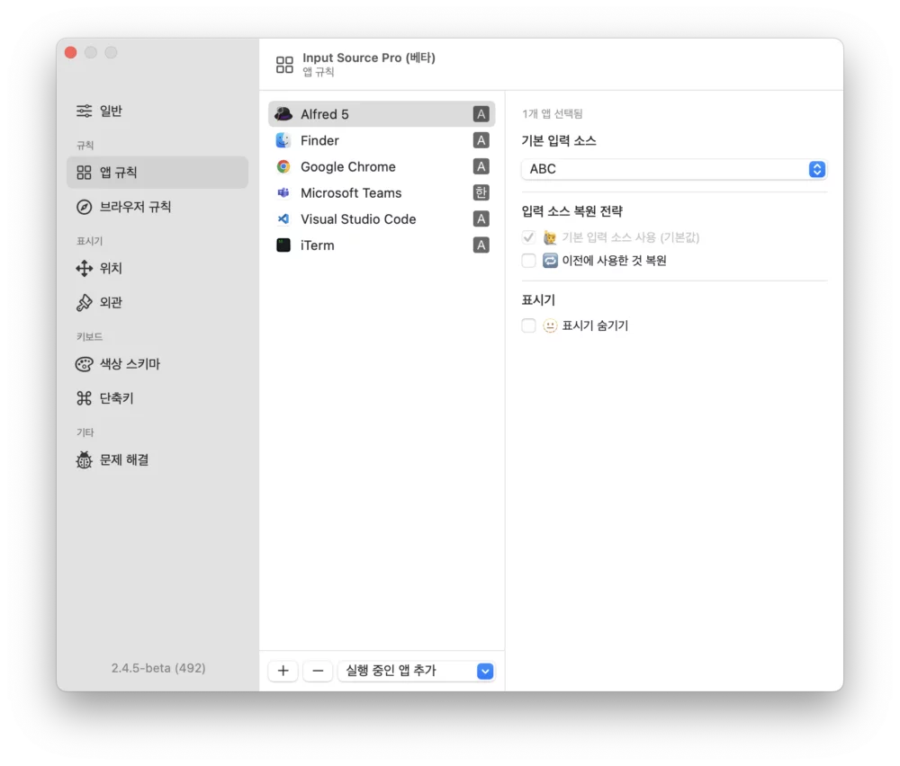 brew install --cask input-source-pro베타 기간 동안은 무료 사용할 수 있다고 한다. 정식 버전이 공개되면 구매도 고려할 수 있을 듯 하다.