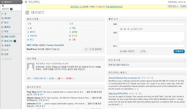 관리자페이지는 뭐 크게 복잡하지도 않고 기능별로 잘 분류되어 있는 것 같다. 더 많은 자료를 보고 사용도 하면서 워드프레스에 대해 익혀나가야 알겠지만 괜히 세계 최고라는 찬사를 듣는 것은 아닌 것 같았다. 세계 최고라 해서 모두 다 그렇게 생각하는 것은 아닐 수 있는데.. 일단 내게는 그렇게 느껴졌다. 실제로 사용해보면 달라질 수도 있을지 모르겠다. 하지만 뭐 일단 어디까지나 가능성을 보기 위해서 설치한 것이니 차분하게 살펴봐야 할 것 같다.